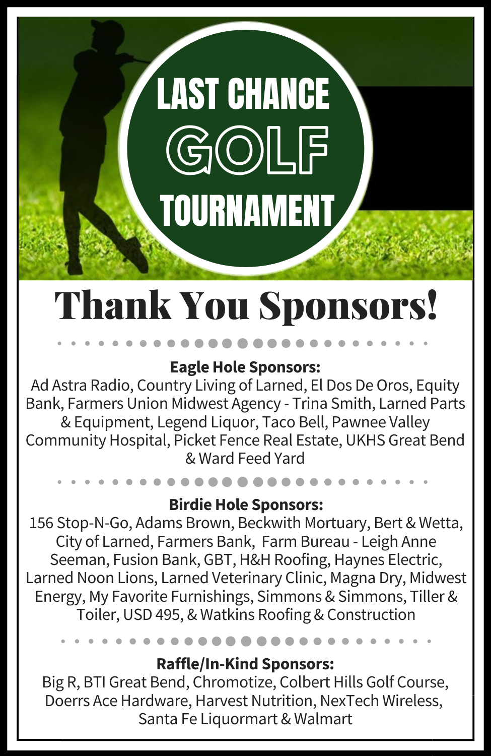 Join the Larned Area Chamber of Commerce on Sunday, September 28th, 2025 for a final opportunity to partake in the game of golf before winter sets in. Entering its 35th year, the Last Chance Golf Tournament will provide one last tournament opportunity. The tournament is run as a 4-Person Team Scramble. The entry fee is $360 per team, including lunch, 18 holes, awards, and prizes. Mulligans are $5 each.