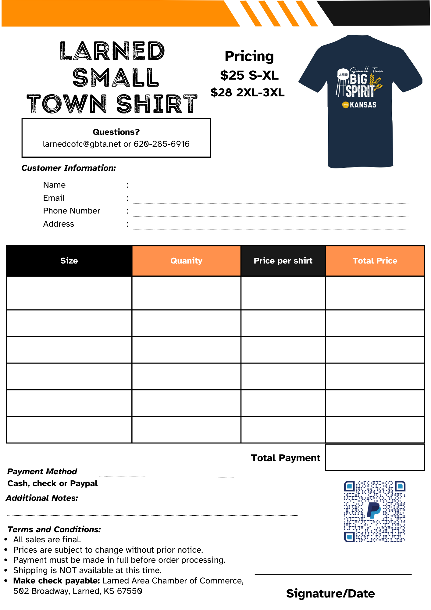 To order your shirt through this page, please fill out the form asking for contact information and shirt details below. You are also welcome to download and print off the order form (via yellow “Order Form PDF” button below) and hand deliver or mail it with your payment of cash or check to the Larned Area Chamber at 502 Broadway, Larned, KS 67550. Payment must be submitted to guarantee a shirt. We may have to order additional sizes from what we have in stock, all depending on the shirt size requested.